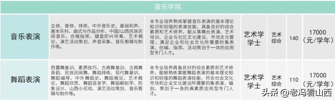设置音乐表演、舞蹈表演两个本科专业。音乐表演专业于2020年被评为学校一流专业,并被推荐为省级一流专业。《键盘即兴伴奏》于2020年8月、2021年9月分别获批山西省精品共享课程和山西省一流课程立项。