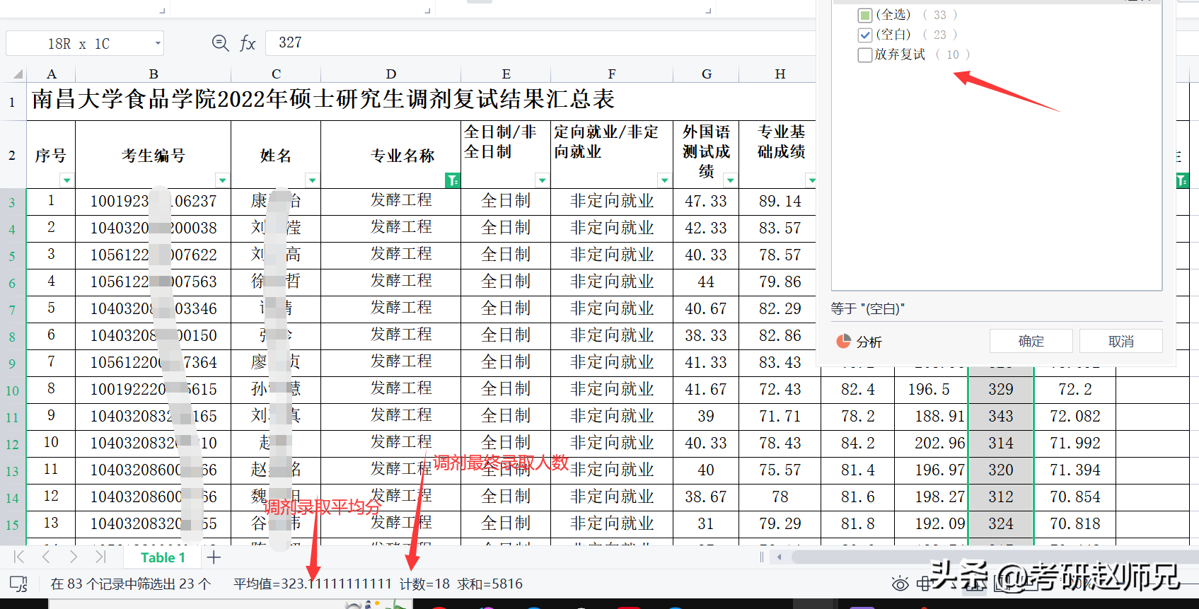 专硕发酵工程:调剂总共33人,但是10人放弃,实际复试23人,刷掉5人,调剂平均分323分,这个分数相对不错的。