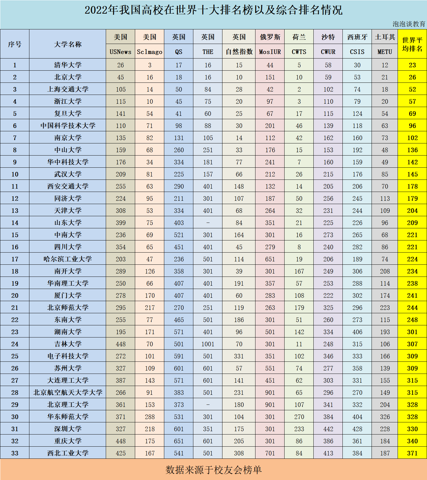 具体的所有高校在各大排行榜以及综合排名情况,请看总表