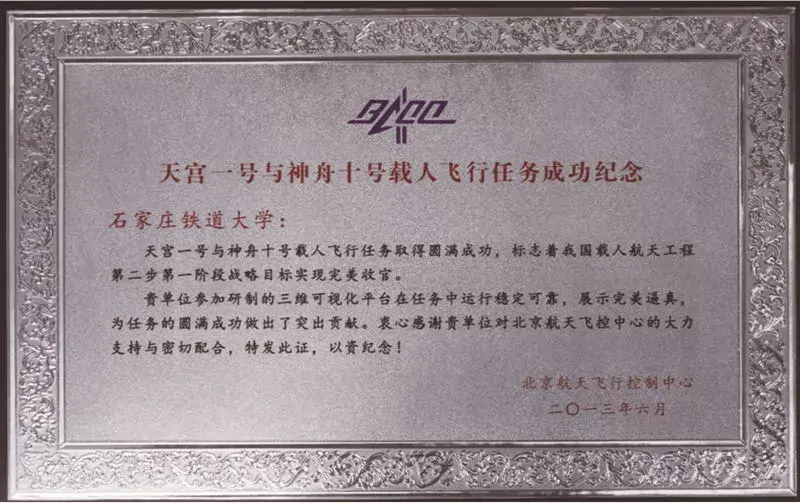 石家庄铁道大学航天可视化团队成功保障了“嫦娥二号”“嫦娥三号”探月工程任务,“天宫一号”与“神舟八号”“神舟九号”“神舟十号”交会对接及“天宫二号”与“神舟十一号”交会对接及后续工程的可视化飞行控制指挥任务,为我国的航天工程提供了技术和保障,做出了巨大贡献。