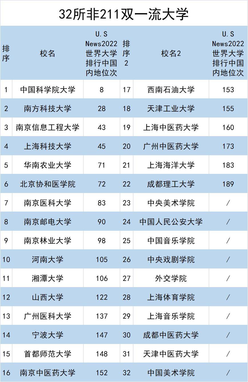 我们知道,双一流大学147所,211大学115所,在双一流中非211的大学共有32所。