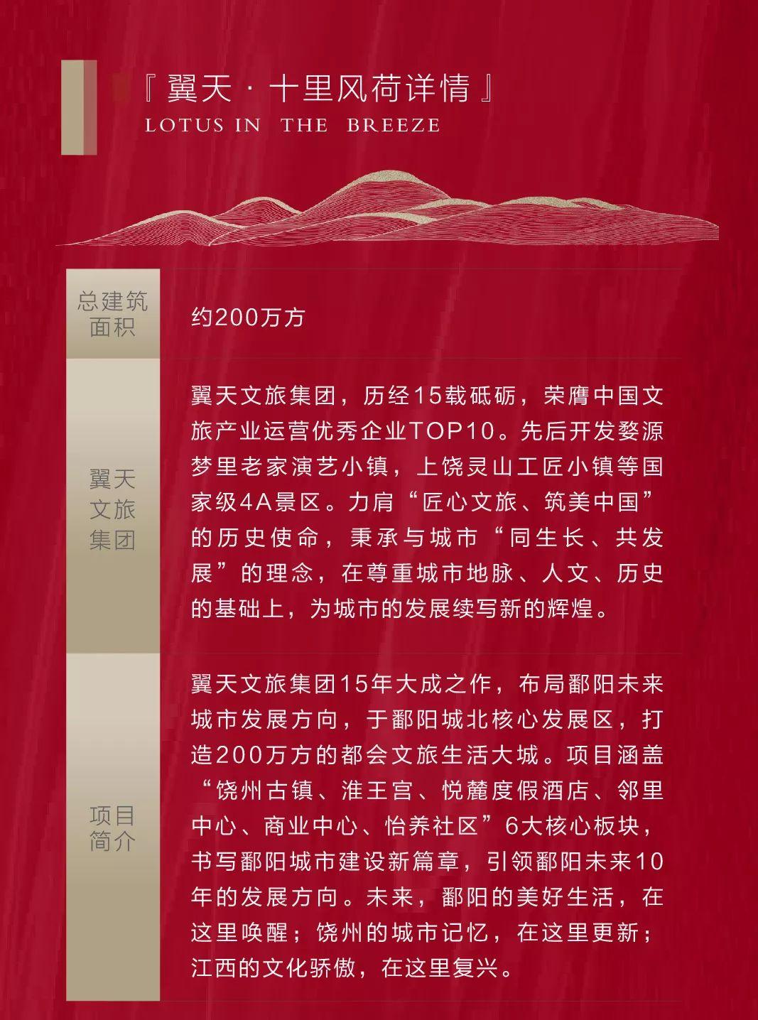 翼天·十里风荷用自身品牌及资源优势,匠心铸就涵盖饶州古镇、淮王宫、悦麓度假酒店、邻里中心、商业中心、怡养社区6大板块,书写鄱阳城市建设新篇章!