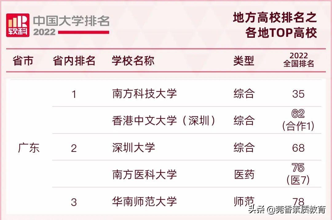 广东既是经济大省,也是教育强省。根据地方高校排名,广东的地方高校五强,都进入了2022全国高校排名主榜的前80名。