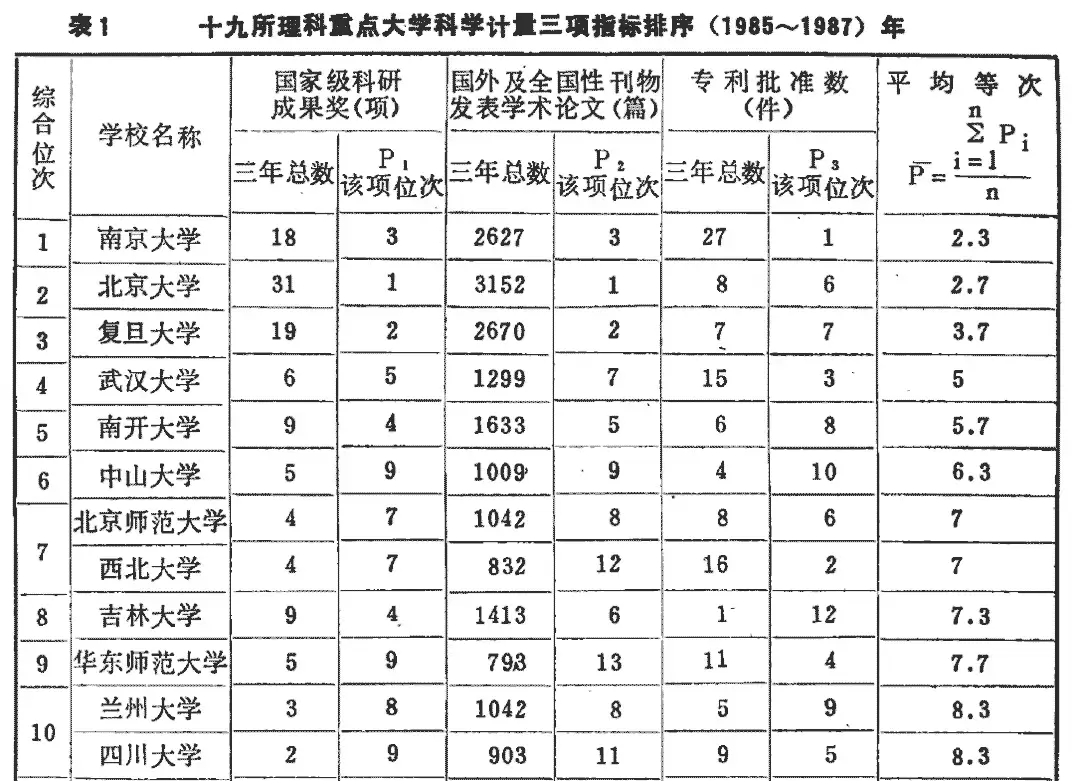 1985年,中央决定评估高校办学水平,“高等学校比较研究”课题组在1990年发布了第一份综合排行榜。这份表单给内地86所重点大学按理、工、农、医等类别排出综合次序,南京大学位列理科大学榜首,而清华大学位列工学类大学榜首。