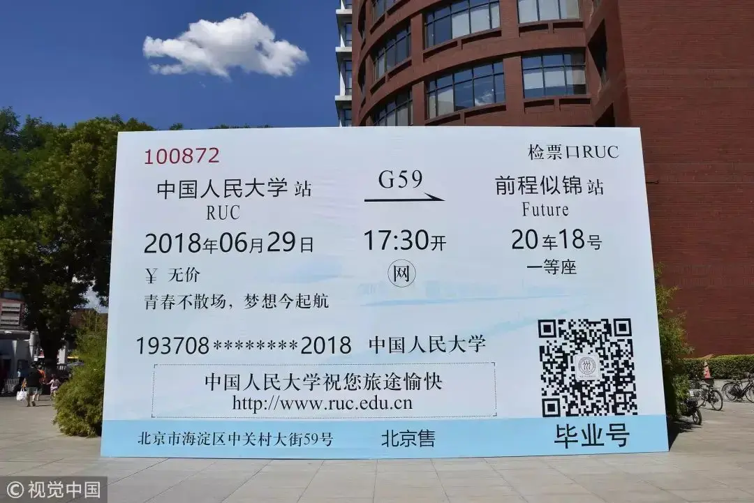 2018年6月28日,北京,人大广场上竖立着一张巨幅毕业“车票”,终点站写着前程似锦 / 视觉中国