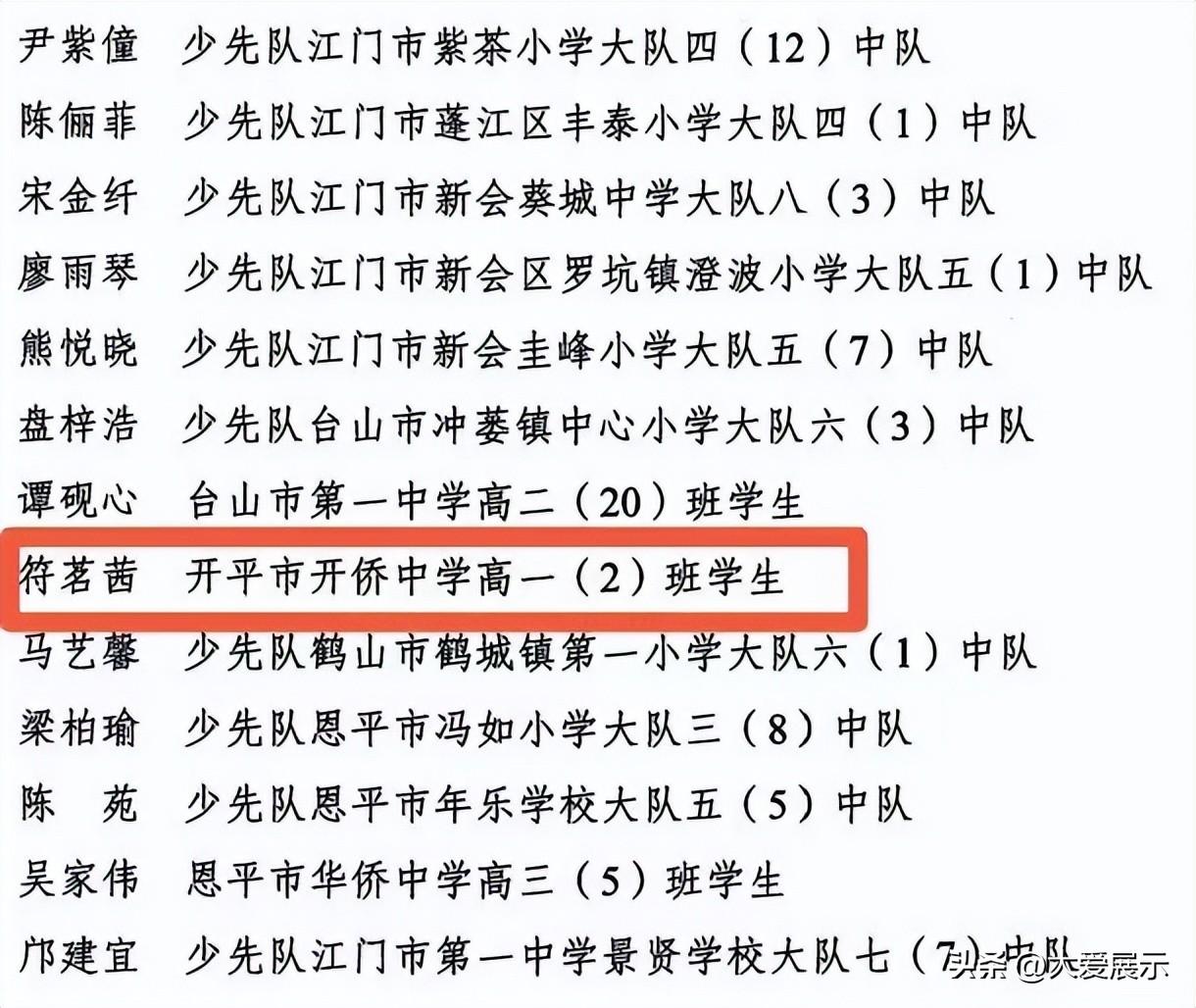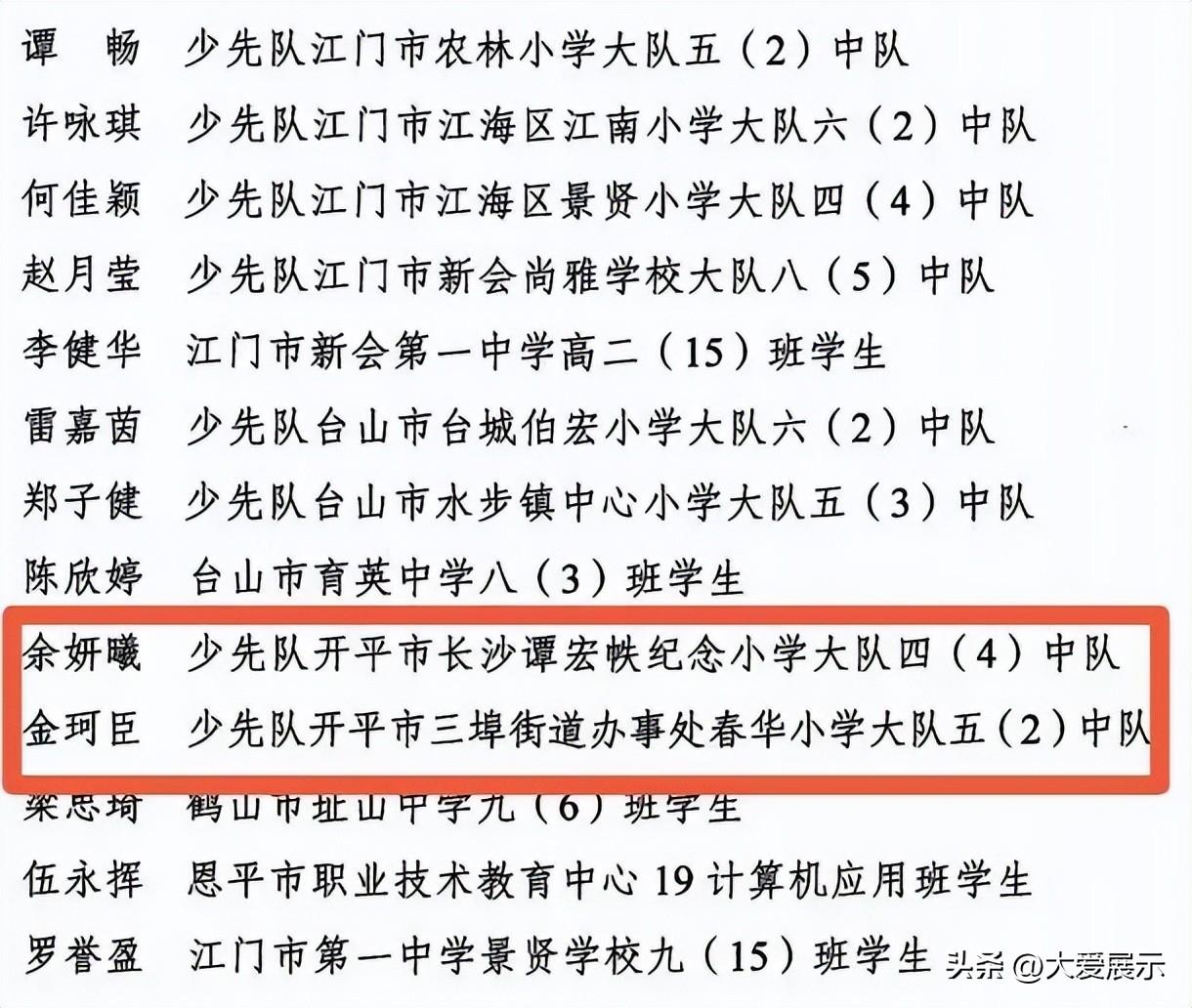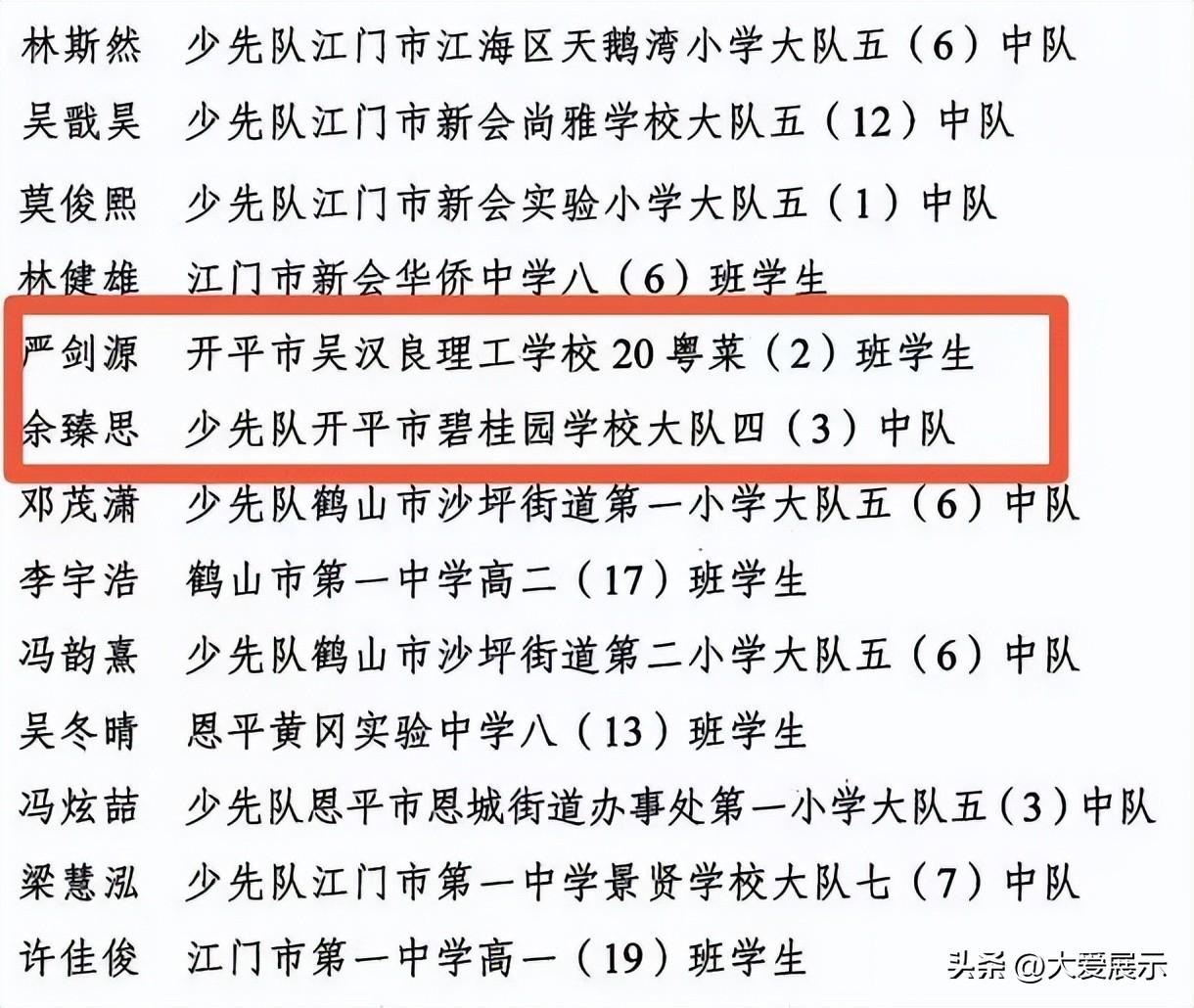 其中开平11人上榜,他们分别是:少先队开平市长沙谭宏帙纪念小学大队四(4)中队余妍曦、少先队开平市三埠街道办事处春华小学大队五(2)中队金珂臣、开平市吴汉良理工学校20粤菜(2)班学生严剑源、少先队开平市碧桂园学校大队四(3)中队余臻思、少先队开平市三埠街道办事处培育小学大队四(2)中队吴羽炘、开平市金山中学九(11)班学生谭一言、少先队开平市碧桂园学校大队四(3)中队谭耀城、开平市开侨中学高一(2)班学生符茗茜、开平市开侨中学高二(9)班学生许平平、少先队开平市长沙梁金山小学大队四(1)中队关煜森、开平市新荻初级中学八(8)班范健成。