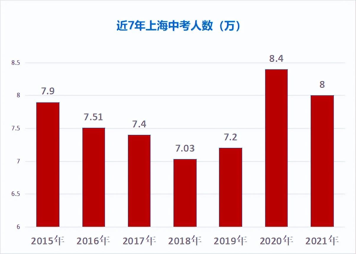 近来年,上海中考人数一直保持在8万人左右,2015-2021分别是7.9万、7.51万、7.4万、7.03万、7.2万、8.4万、8万,今年人数大幅上涨,同比去年增加3万。