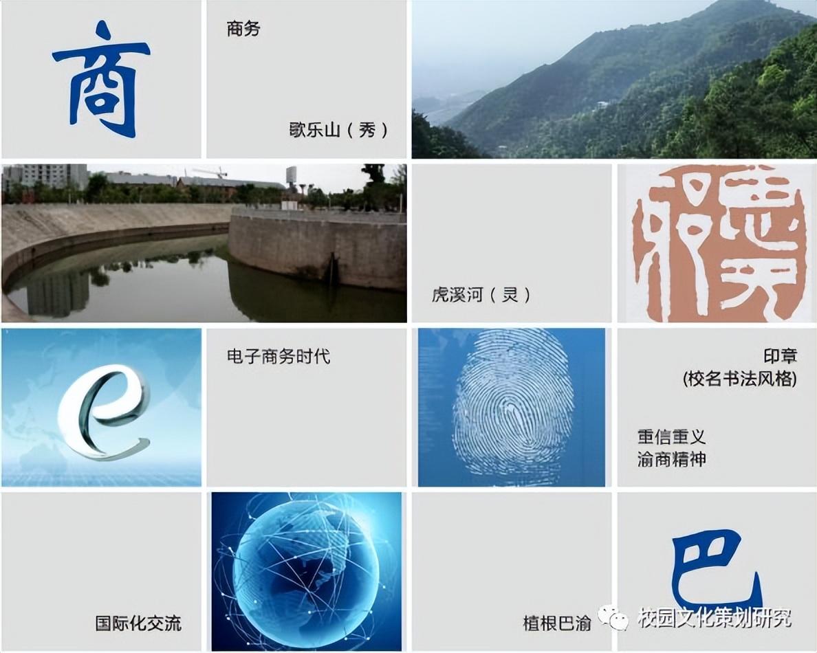 “商”字、“歌乐山”、虎溪河、印章、互联网代表元素“e”、指纹、地球、“巴”字。