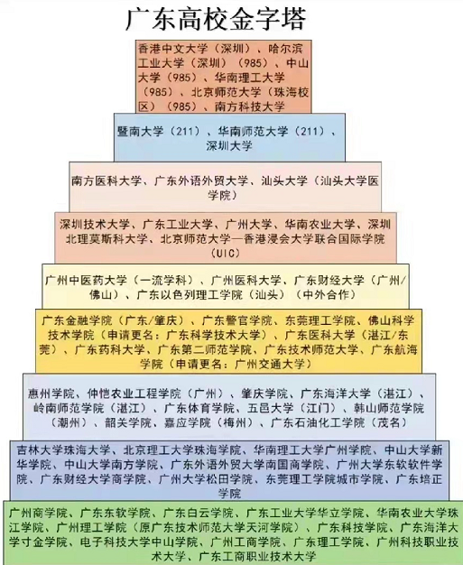 虽然高校林立,但是高校之间在教学水平和专业方向终归还是会存在一定的差别,如果按照学校的办学实力、分数线等方面进行排名,可以看到一个属于广东省高校的“金字塔”排名。