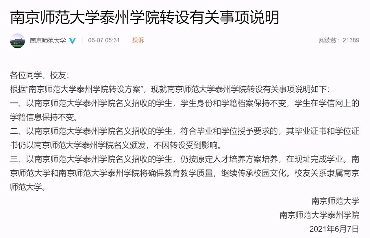 南京师范大学泰州学院转设有关事项说明 来源:新浪微博