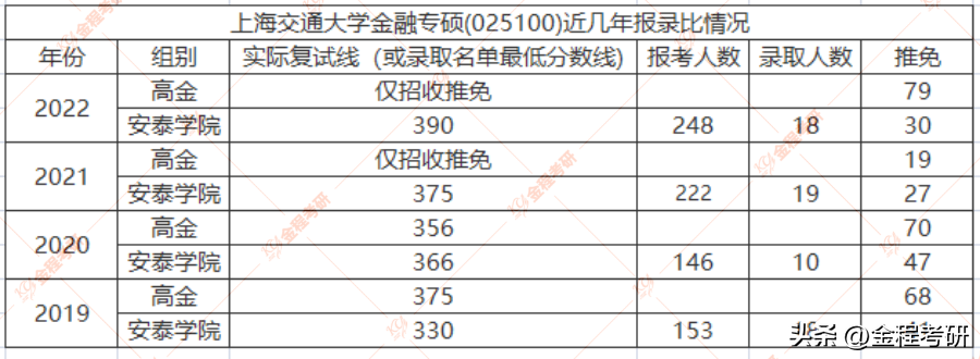 上海交通大学安泰经管学院是全国首批获准招收金融硕士专业学位研究生的院校之一。2011年,第一届安泰金融硕士学生入学,至今已有10届毕业生。在项目师生的共同努力下,已在国内高校和社会上树立了良好的口碑。在2014年全国金融硕士专业学位授权点专项评估中,安泰金融硕士项目名列前茅。2017年《服务需求,对接行业:安泰金融硕士项目培养体系建设》获得第八届上海市教学成果奖一等奖。本项目立足上海国际金融中心建设,服务全国经济转型和升级,融合本土化和国际化,致力于培养掌握现代金融理论、具有国际视野、家国情怀的高层次、应用型、复合型人才。