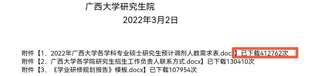 广西大学研究生院,在3月2号发布了一份《2022年广西大学各学科专业硕士研究生预计调剂人数需求表》(这份需求表并没有实质性内容,因为,那个时候复试线都没有出来),但是,依旧被下载了41万多次。