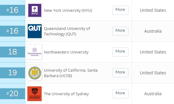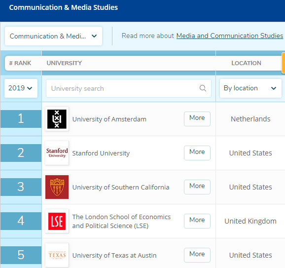 斯坦福大学第2,榜单第3为南加州大学,榜单第4为伦敦政治经济学院,榜单第5为得克萨斯大学-奥斯汀分校,榜单第6为加州大学伯克利分校,伦敦大学金史密斯学院(第7名)。