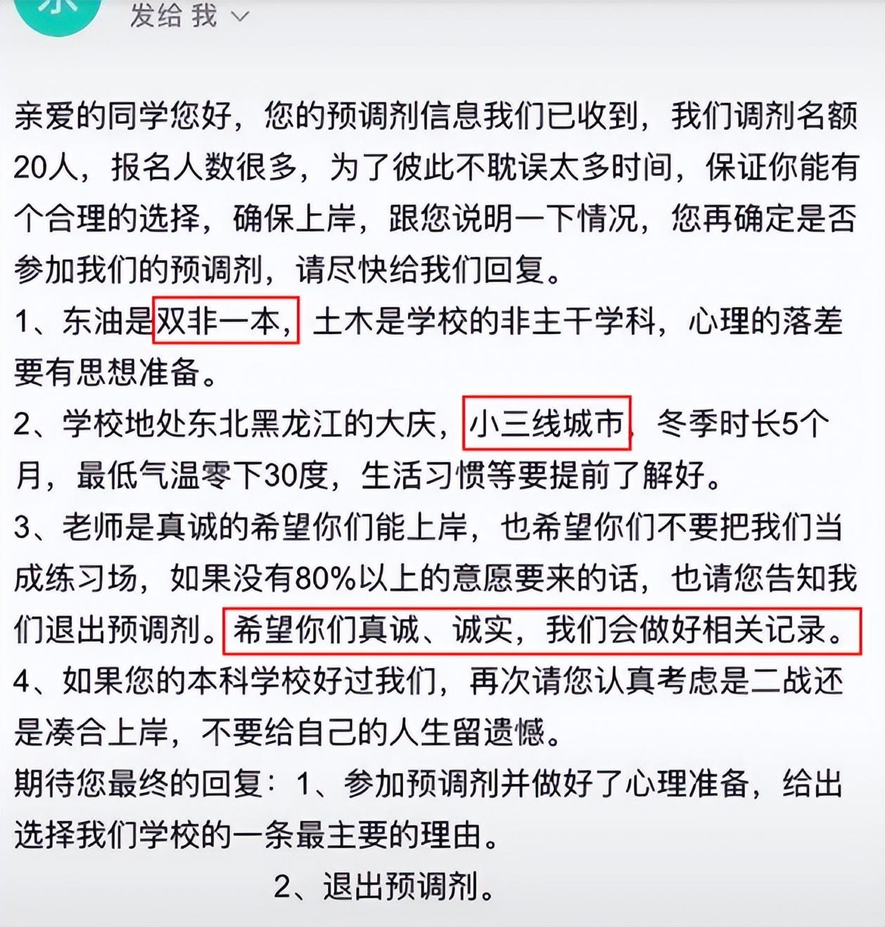 在调剂的过程中,大部分的学校可能都会尽可能地去吸引更多的考生,方便自己进行选拔人才,但是东北石油大学则是和众多学校“背道而驰”,调剂回复没有“套路”,尽显真诚。