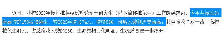 2023年推免人数公布,今年共接收96所高校的158名推免生,较2022年增加74人,增幅88%,录取人数创历史新高。其中接收“双一流”高校推免生41人,占总接收人数的26%,生源结构变化明显。