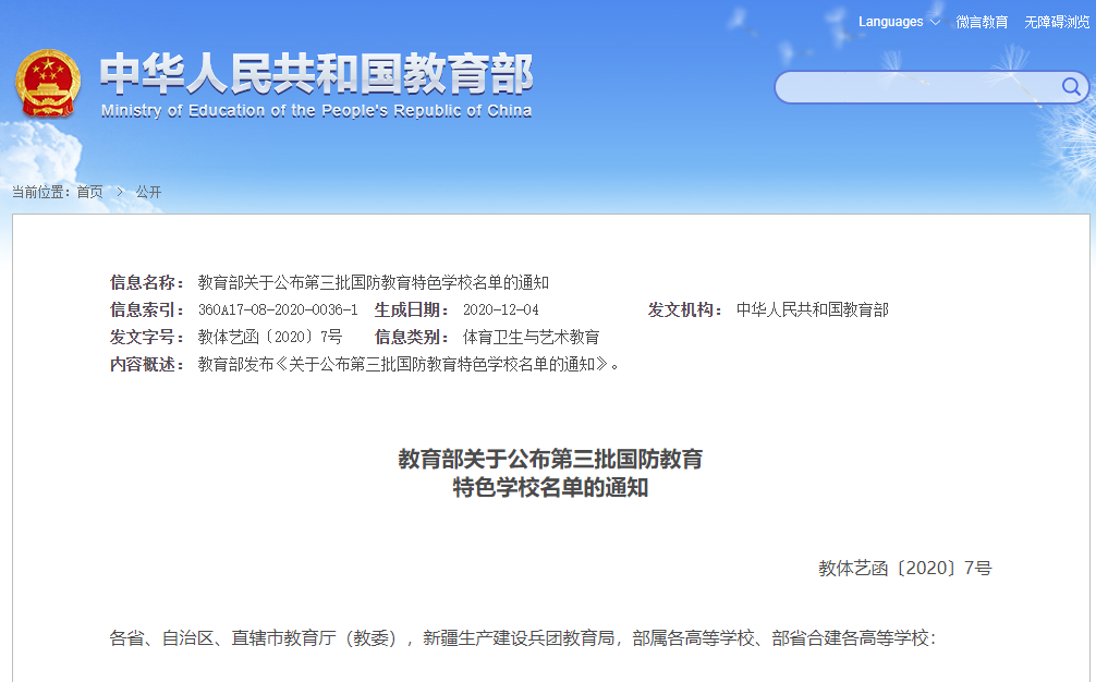 ● 对经遴选认定的学校,由教育部命名为“国防教育特色学校”。