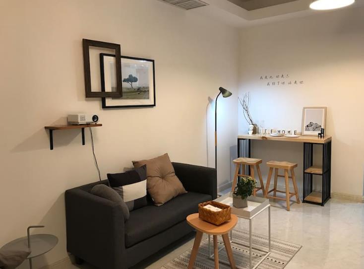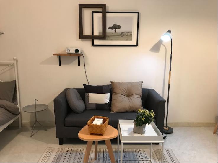 柔软舒适的宜家沙发,智能清晰的投屏设施,傍晚点起浪漫的星星灯,秒变私人影院,这里地理位置优越,卫生也是一级棒,高级智能电子锁让人住着更安心。