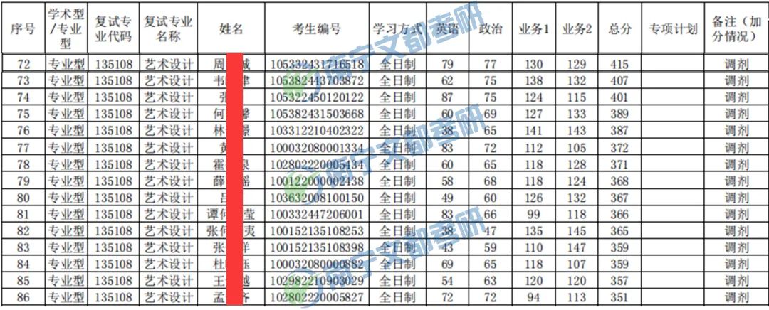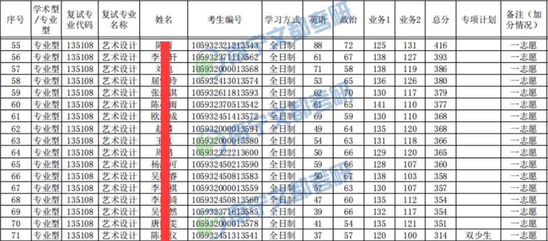 很多同学都在网上看到考研黑名单什么的,说广西大学压分、不保护一志愿之类的,其实并不是真的。当然,也不排除有些专业这样做,但是广西大学艺术设计专硕并没有这样。我们看上边的一志愿复试名单就可以知道,广西大学艺术设计一志愿过线就可以复试了,而且专业课得分都比较正常,没有压分的情况出现,专业课一的得分都在125分以上,有不少130多分的,专业课二的话得分会略微低一些,考的内容也比较难,但是同样也有130多分的高分同学存在。一志愿录取的情况就简单说一下好了,因为除了那个复试不及格的同学以外,其他一志愿考生都被录取了,所以我们就算初试考得再怎么好,复试也要好好准备的呀,考试没结束以前都不要掉以轻心,要人认真对待的呀。