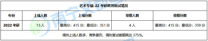 不得不说,广西大学真的不愧于它“调剂小清华”的称号哦,在22考研中,调剂上线人数15人,录取人数只有4人,调剂复试差额高达375%。调剂是个人综合实力的比拼,虽然看着广西大学艺术设计专硕过国家线就能调剂,但是广西大学调剂历来都是看本科的哦,所以本科一般的同学,小编建议调剂的时候就不要考虑广西大学了。如果调剂上线了,也要好好重视复试的准备,22考研调剂复试中还有400多分的调剂被刷的呢,千万不能掉以轻心啊。