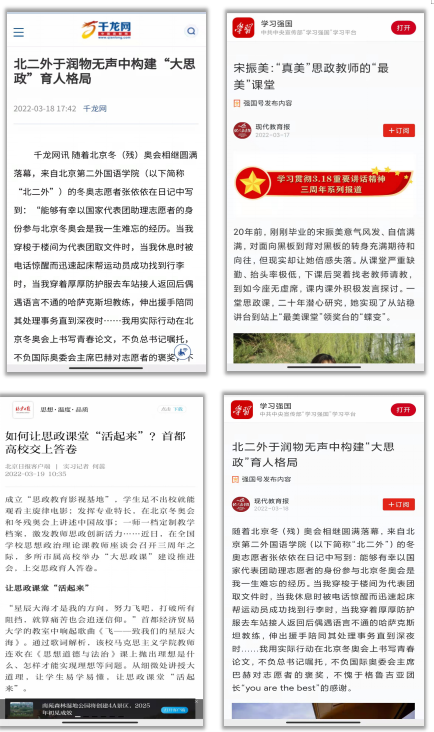 青年是祖国的未来、民族的希望。立德树人是检验高校一切工作的根本标准。思想政治理论课是落实立德树人根本任务的关键课程,发挥着不可替代的作用。近年来,北京第二外国语学院通过一系列举措加强思想政治理论课建设,构建“大思政”育人格局,取得了显著成效。近日,现代教育报、北京日报等媒体平台对此事进行了关注报道。