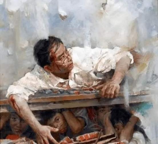 学生们此时对谭老师无比地信任,纷纷跑向讲台躲进讲桌里,谭千秋自己趴在讲桌上,用身体为学生挡住掉下来的混凝土和钢筋。