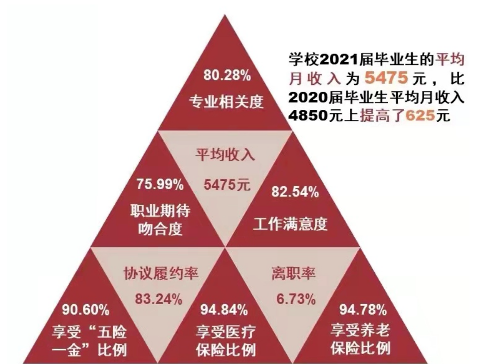 据学校公布的2021届毕业生就业质量报告显示:该校2021届毕业生年终就业率为97.44%,其中协议就业和合同就业率位75.96%。