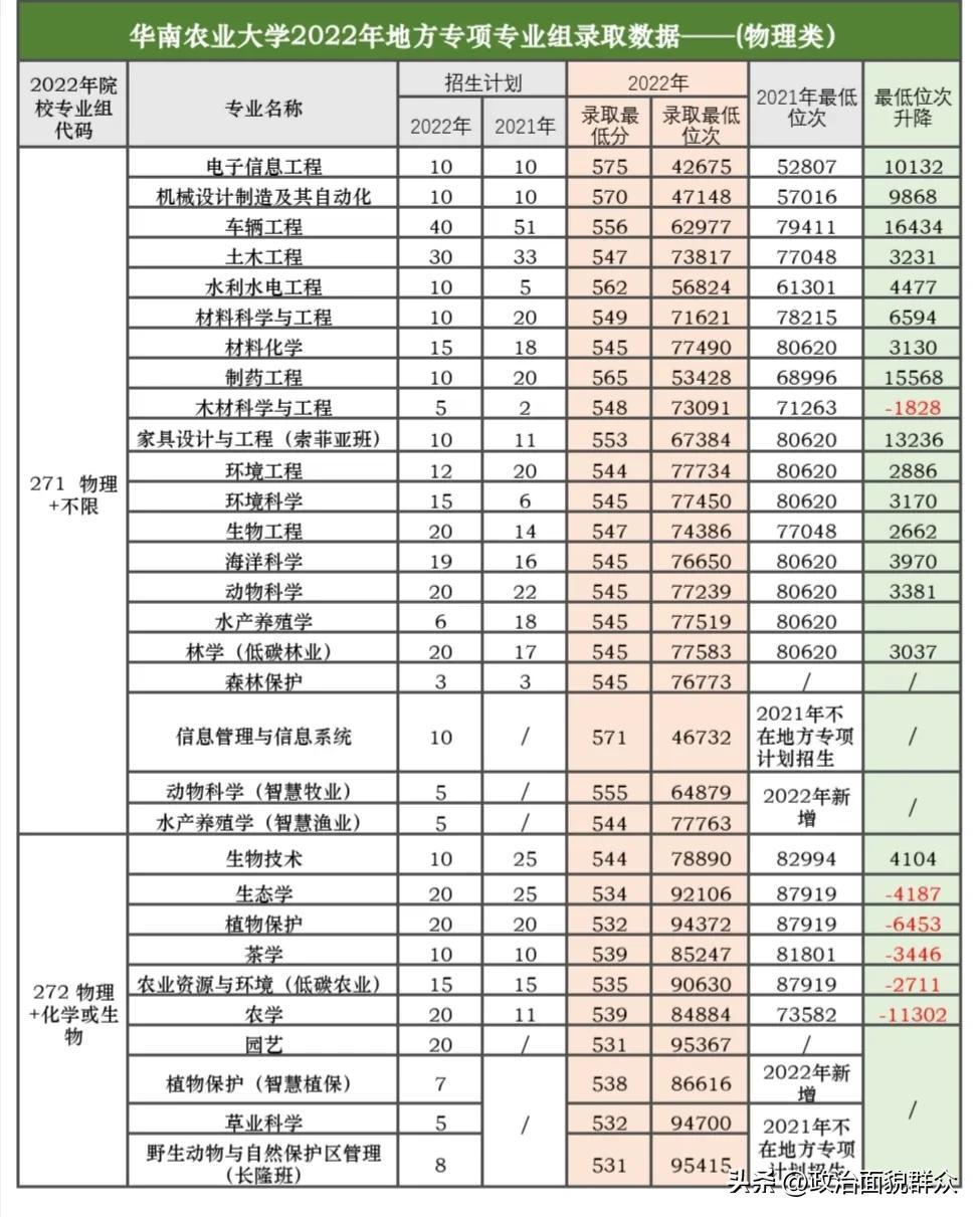 华农的地方专项仅在物理类招生,共有2个专业组,271专业组以非农专业为主,272专业组则以农学类专业为主。