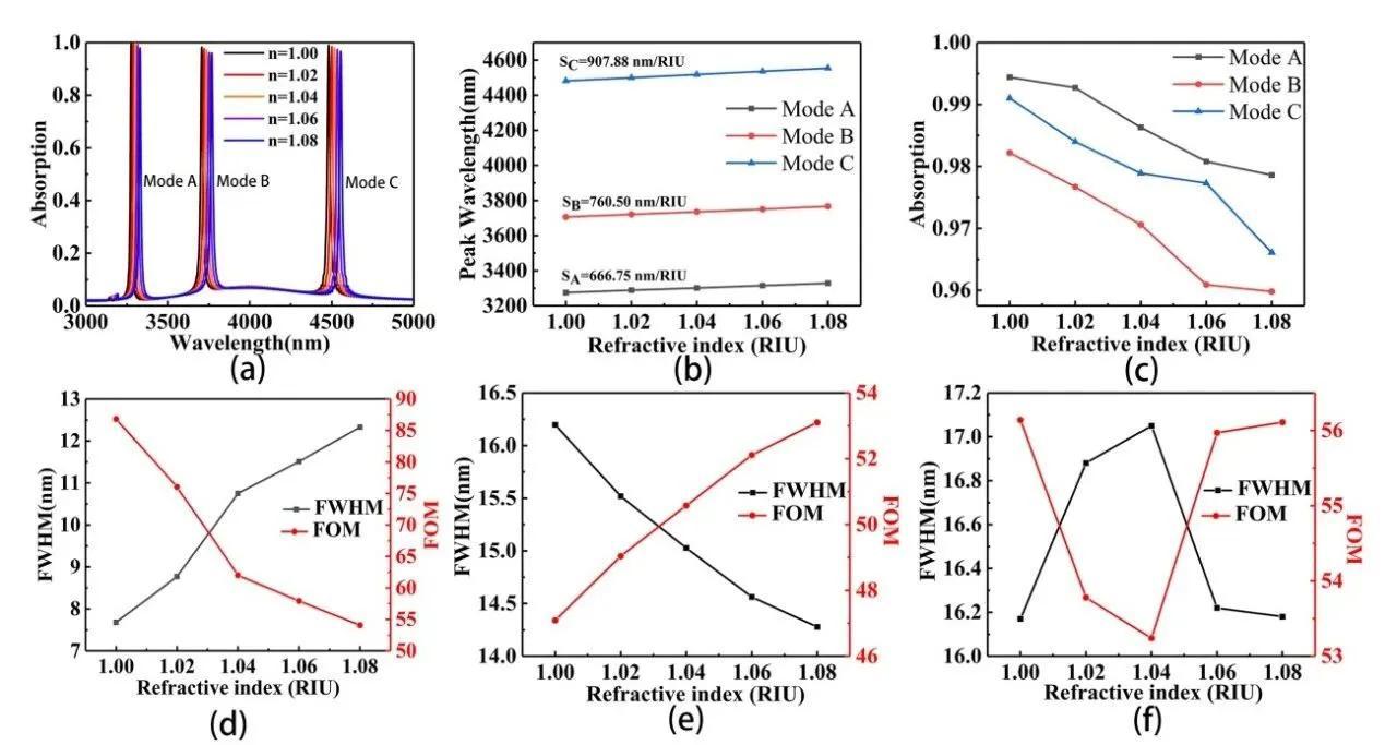 图3 (a-c)不同折射率下三种模式的吸收光谱及灵敏度线性关系;(d-f)分别表示模式A、模式B和模式C的FWHM和FOM与折射率变化的线性关系。