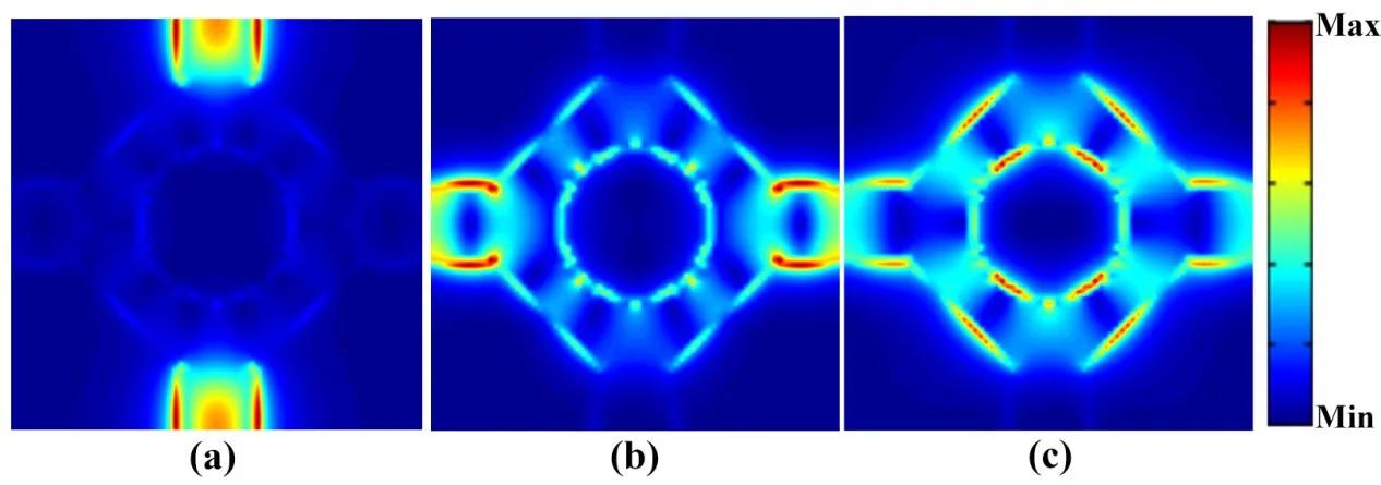 课题组在前期基础上,探究了上述三波段吸收峰的物理机制计算了单层石墨烯表面的电场分布情况(见图2)。电场强度主要局限于图案化石墨烯的四臂中,且随着波长的增加,局域电场向着中间圆形区域边缘部分移动,且圆形区域边缘中的电场强度比其他区域强。这主要是由于图案化石墨烯与电磁波的耦合,并提供电偶极子共振,在金属膜上进行反相振荡。最终,入射电磁波被石墨烯表面的局域电磁场所吸收。