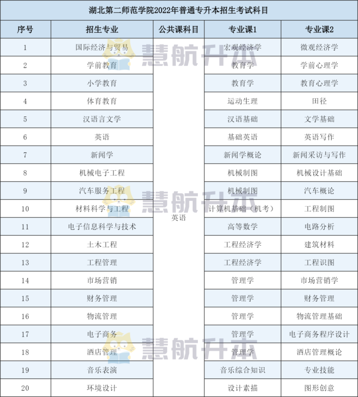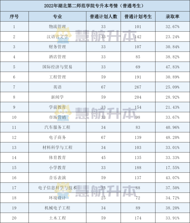 2022年,湖北第二师范学院专升本招生专业共20个。