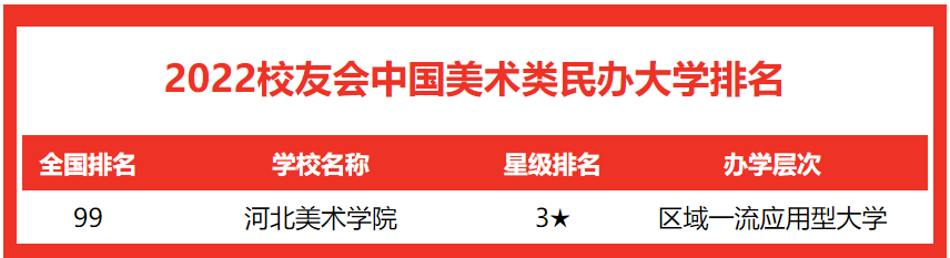 在最新校友会2022中国民办大学排名中,河北美术学院综合实力排名最高、办学水平最高,名列2022中国美术类民办大学排名首位。
