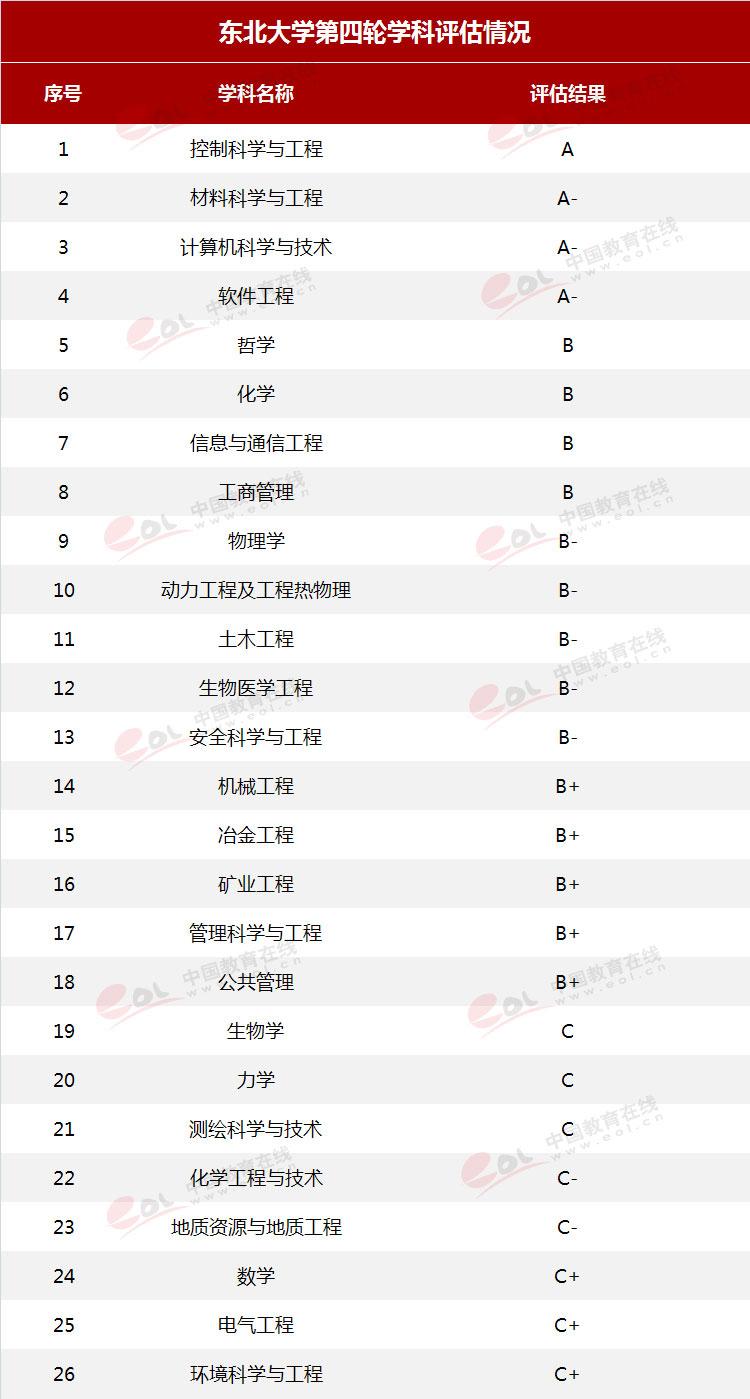 在教育部2017年公布的全国第四轮学科评估结果中,东北大学共有4个学科进入A档。其中控制科学与工程入选A,材料科学与工程、计算机科学与技术、软件工程入选A-。