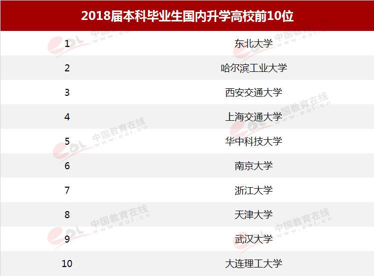 东北大学2018届本科毕业生升学比例为45.7%(包括国内升学和留学),较2017届提升0.4个百分点,再创历史新高。其中,毕业生国内升学高校主要为“双一流”大学, 2018届本科毕业生国内升学高校前10 位名单见表下表: