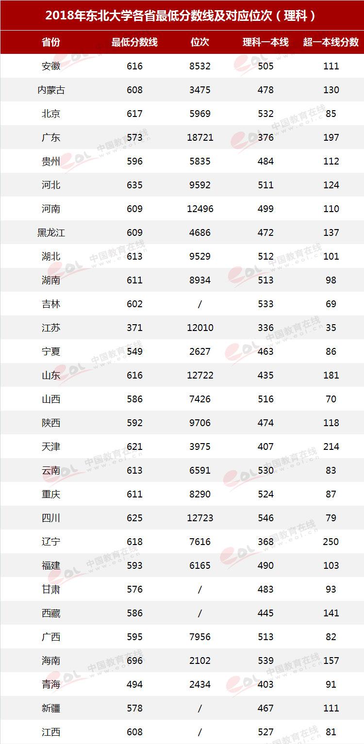 以下是中国教育在线整理的东北大学2018年在各地录取最低分及对应位次,供考生参考。