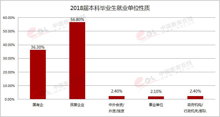 东北大学2018就业单位主要是民营企业(56.80%)及国有企业(36.30%)。