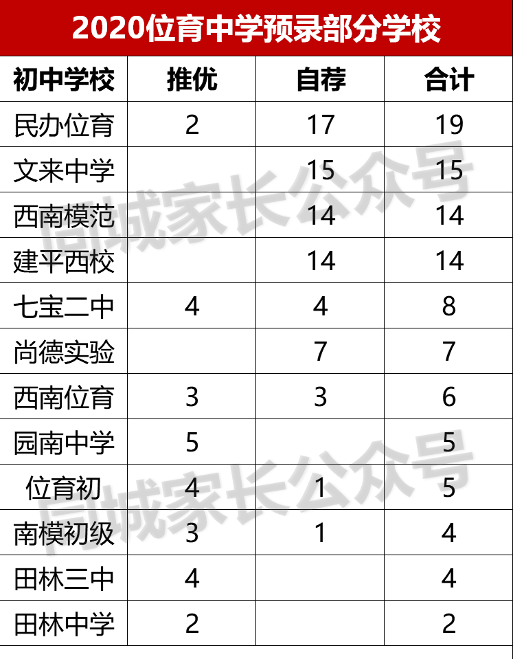 民办位育自招录取19人,文来中学自招录取15人,西南模范、建平西校自招录取均为14人,这四所初中是位育中学的主要生源输入校。
