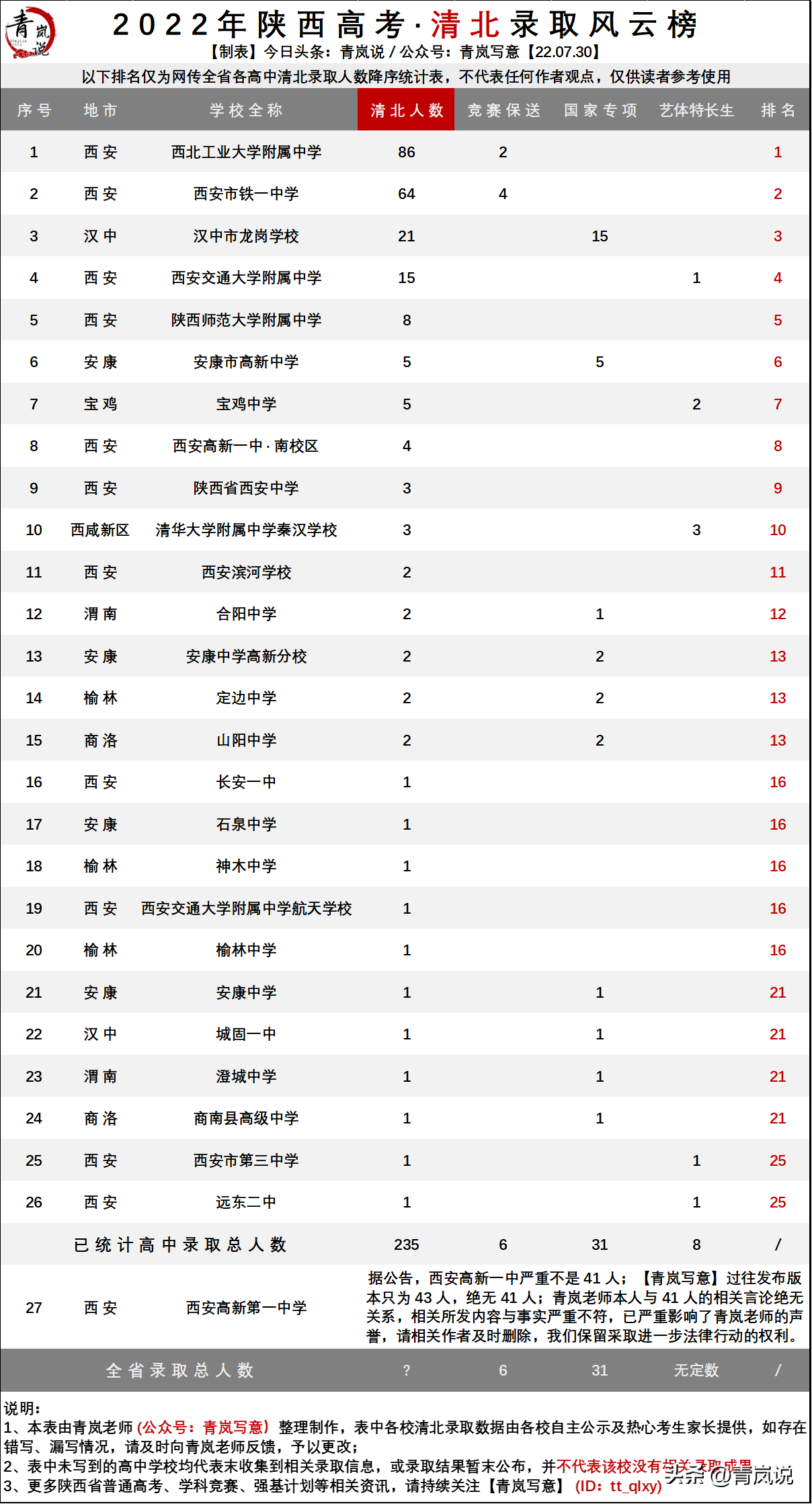 另外,经交涉,2022年陕西高考清北录取风云榜已重置,【高新一中本部】与【高新一中南校区】因校区、管理、教学分开进行的原因,将采取同【安康中学】与【安康中学高新分校】一样的统计口径,将两校区分开统计。