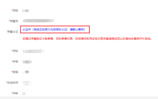 学籍验证:您只有通过学籍验证才能参赛(中职学生除外),您的参赛记录、获奖情况和写实性记录将直接推送至山东省综合素质评价系统。