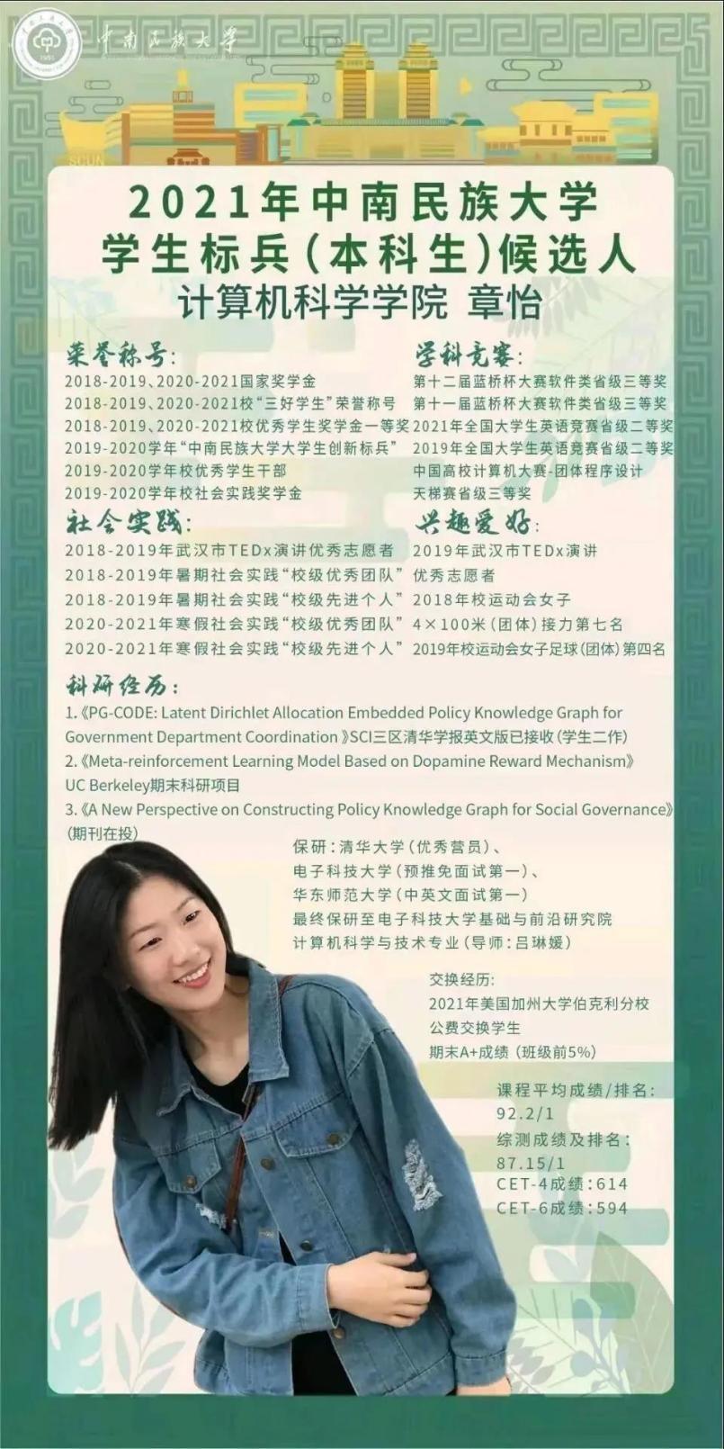 章怡,来自计算机科学学院,保研至电子科技大学基础与前沿研究院计算机科学与技术专业。课程平均成绩/排名92.2/1;综测成绩及排名87.15/1。曾作为公费交换学生前往美国加州大学伯克利分校学习。获国家奖学金、优秀学生奖学金一等奖等荣誉;获全国大学生英语竞赛省级二等奖、中国高校计算机大赛-团体程序设计天梯赛省级三等奖等奖项。以学生二作发表的论文被SCI三区清华学报英文版接收。