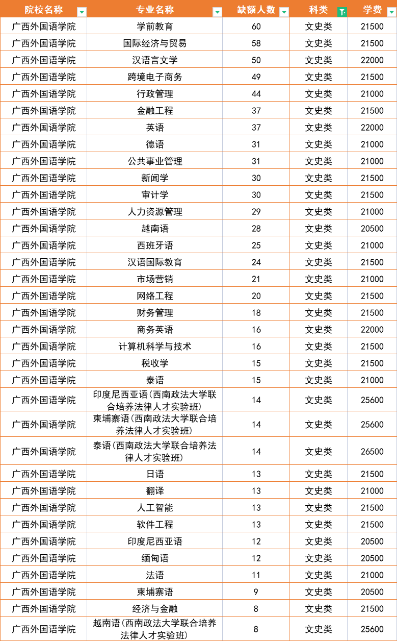 在广西外国语学院缺额的专业中,我们发现有金融工程、人工智能、网络工程、市场营销、人力资源管理等一批与语言相关度不高的专业。