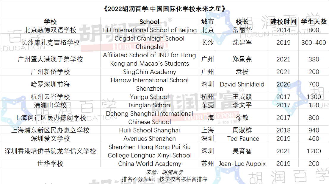 《2022胡润百学·中国国际化学校未来之星》旨在寻找具有潜力的中国国际化新学校,综合考量新学校的师资团队质量等软性指标,以及合作伙伴的实力等等。上榜学校为目前还未有高中毕业生的K12学校,虽然没有毕业生数据,但已经受到了很多行业内外的关注和期待。