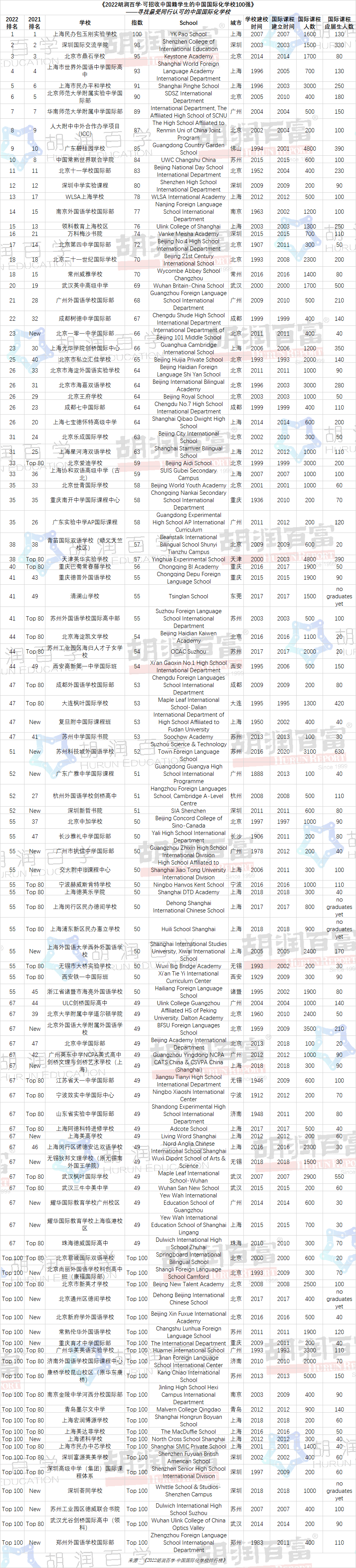 《2022胡润百学·可招收中国籍学生的中国国际化学校100强》的上榜学校可以招收中国籍和外籍学生。上榜学校共来自中国24个城市,平均成立时间13年,历史最长的是成立29年的北京市私立汇佳学校和广州华美英语实验学校,在校学生总人数约12万人,平均每所学校1100人。