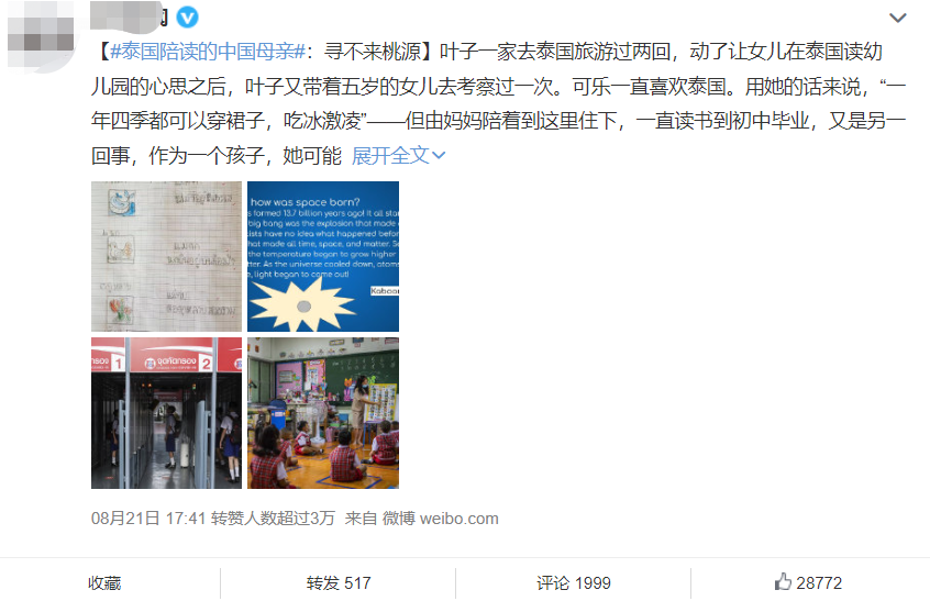 话题中我看到了几位泰国陪读妈妈一路走来的心得体悟。她们有的为了追求教育理念,有的因孩子的学习问题“被迫”来到泰国,却又遇到新的迷茫,让人们重新审视近年来热门的泰国低龄留学。