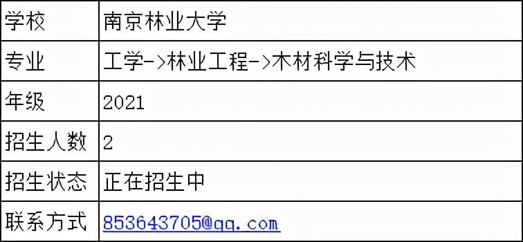 1. 招生学校信息南京林业大学,材料科学与工程学院木材科学与技术:国家“双一流”重点建设学科,国家级重点学科,江苏省优势学科,江苏省品牌专业硕士:082902 木材科学与技术(★“双一流”重点建设学科★国家重点学科▲国家林业局重点学科▲江苏省高校优势学科)2. 导师信息姓名:蒋军性别:男职称:讲师、学术型硕士生导师学术成果:发表学术期刊论文25余篇(18篇SCI收录)科研项目:主持国家自然科学基金1项、中国博士后面上资助1项、南京林业大学科研启动项目1项;参与国家自然科学基金、江苏省自然科学基金等项目多项。研究方向:主要从事木材功能性改良、木质复合材料、纳米材料方面的研究工作。简介详见:http://wood.njfu.edu.cn/info/604联系方式:有意向者发简历至邮箱:853643705@qq.com(Wechat:bjfunjfuwood)(邮件中信息注明:毕业院校/专业/考研成绩/毕业论文题目/四六级成绩/联系方式等相关信息)招生范围:欢迎材料科学与工程、化学、木材科学与技术、生物质化学等专业方向加入