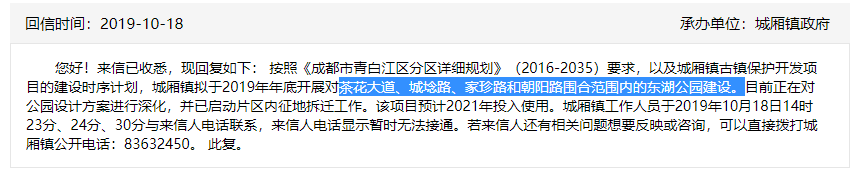 按照《成都市青白江区分区详细规划》(2016-2035)要求,以及城厢镇古镇保护开发项目的建设时序计划,城厢镇拟于2019年年底开展对茶花大道、城埝路、家珍路和朝阳路围合范围内的东湖公园建设。目前正在对公园设计方案进行深化,并已启动片区内征地拆迁工作。该项目预计2021年投入使用。