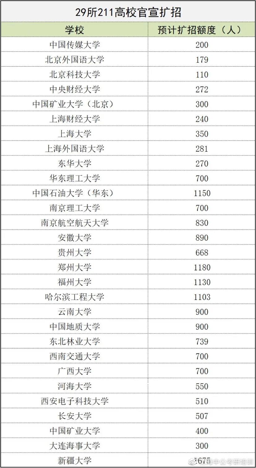 从表格中我们可以看出,图中的3所211同时是双一流大学都在扩招:新疆大学扩招幅度最大,为70.53%,云南大学其次,为23.68%,郑州大学也20-21也扩招了17.39%,这些院校和其他大多数985一样采用了扩招的策略。985院校中仅有5所大学计划缩小招生,比如南开大学和北京航空航天大学,2020年研究生招生人数分别减少3.93%和9.84%,2021年招生人数又分别下降了2.73%和9.09%,这种现象在众多的985大学中是非常少见的。除此之外,还有26所211大学,合计29所211大学也相继扩招!