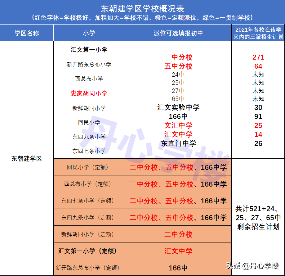 学区派位简析学区派位代表着该学区小升初的底限,对家长来说非常重要,上表的三派数据来自家长帮论坛,仅供参考,24、25、27、65中在东朝建的三派名额2021年约为160、110、110、90人,这四个初中都谈不上优质,都是官方“钦定”的一派校,有校额到校的扶持。二分给的名额最多,五分也有一些,文汇和汇文都是只给一点(文汇派位生源应该都安排到南校了,汇文实验和汇文本部一体化),这四所最好的初中,家长反馈一般家庭都派不上,因为史家的ZB太多了。其他小学的定额直升数量其实也不多,每届大概也就三四十人、一个班的容量,但多少是个安慰。对一般家庭来说,东朝建三派最大中签率、又相对理想的去向,应该是166(东直门中学也很难派上).