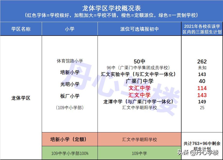 小学概况简析龙潭-体育馆路学区,简称龙体学区,也是东城热度很高的一个学区。该学区内除了体育馆路小学一般外,其他三个小学都不错,——培新和板厂小学评价最好,光明小学以前是市重点、现在反馈不如培新和板厂。培新有40个定额直升汇文朝阳(牛小+一般初中)的政策,其他三所小学在东城官方资料里我没看到有定额直升的政策,但一直有人说有......109是一所一贯制学校,小语种特色(西班牙语),某种意义上属于点招校,但对大多数家庭来说没多大意义,略过。