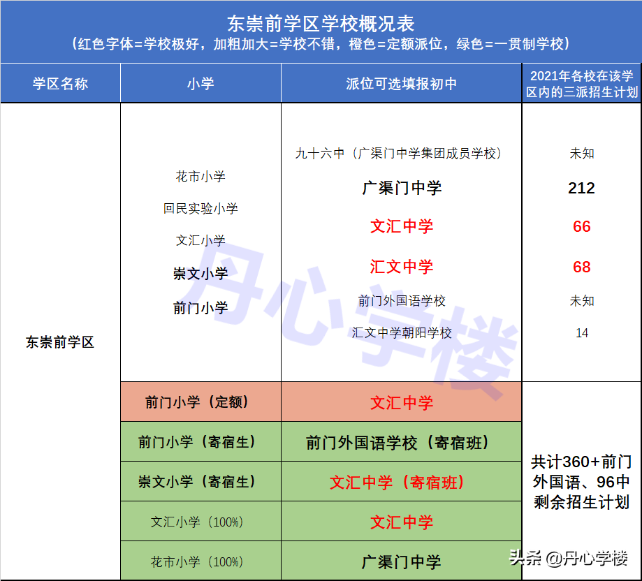 学区派位简析学区派位代表着该学区小升初的底限,对家长来说非常重要,上表的三派数据来自家长帮论坛,仅供参考,2021年96中和前门外国语学校在东崇前的三派名额大约为75、90人。广渠门中学是东崇前的属地校,东城很有名的牛中,分的名额最多,派位到文汇、汇文的几率也比较高,前面我已经科普过了文汇和汇文,这里不再赘述,目前文汇把派位生源安排在南校区,一般认为南校不如本部、文汇南>汇文南,现在文汇本部只接收崇文小学寄宿生和文汇小学直升生源。96和前外,你们懂的。汇文朝阳,汇文一堆扶持校之一,汇文高中部很强是共识、扶持校不好评价,而且它没校额到校。