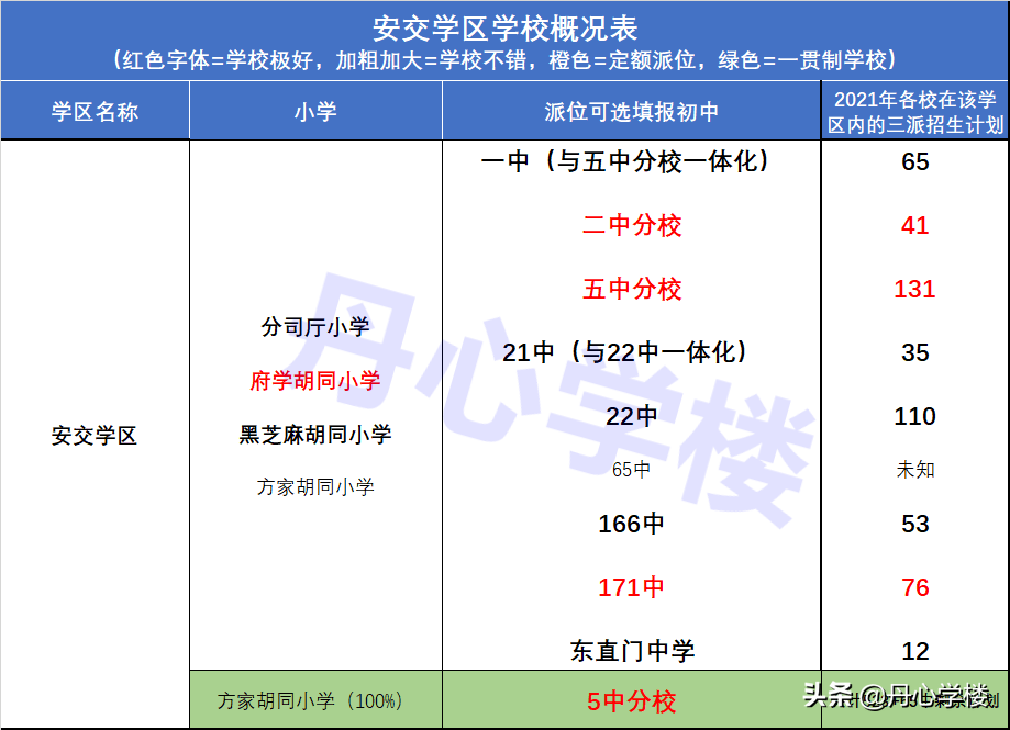 学区派位简析学区派位代表着该学区小升初的底限,对家长来说非常重要,上表的三派数据来自家长帮论坛,仅供参考,65中2021年在安交的三派计划可能在90人左右。从上表可以看出,安交派位到优质初中的概率几乎是东城最高的,五分是东城最强初中、也是安交属地校,二分和171也很好,166和东直门属于中等偏上,22再靠后一些,一中、21中以前是坑但现在都获得扶持、一体化就是和名校生源混编上课、四舍五入也是名校了,65是安交最大的坑、但人家有校额到校的福利。
